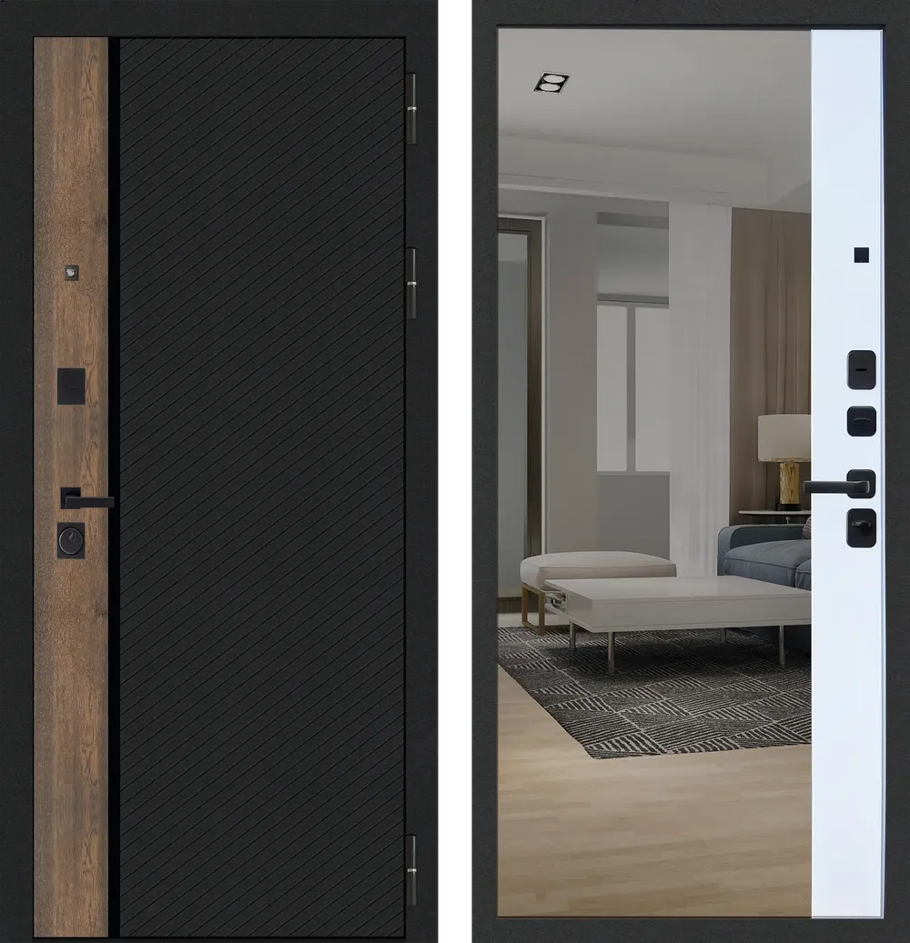 Отделка снаружи: Фрезерованная МДФ-панель 10 мм ФЛП-26 Шагрень черная/ Грецкий орех/ пластик черный